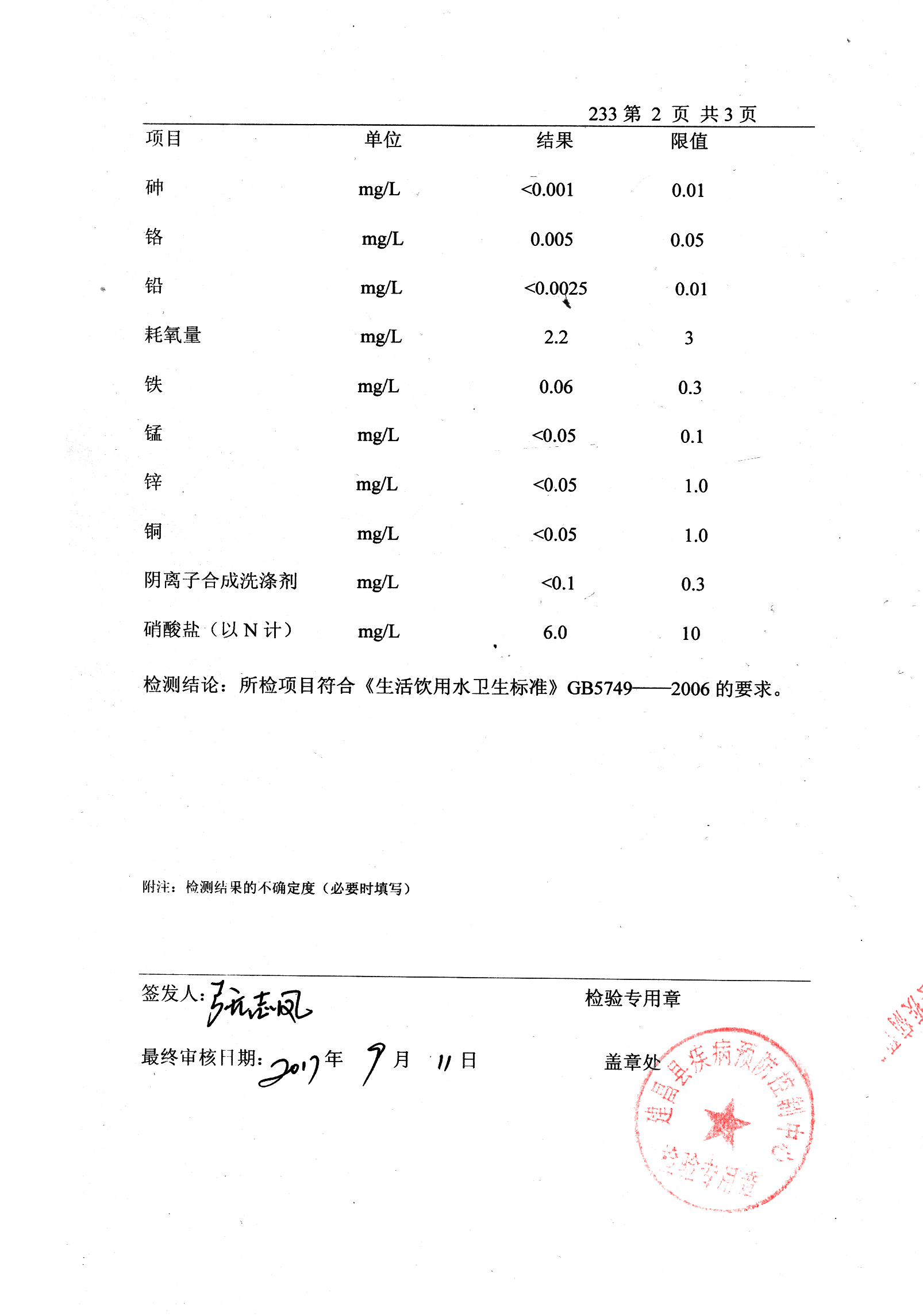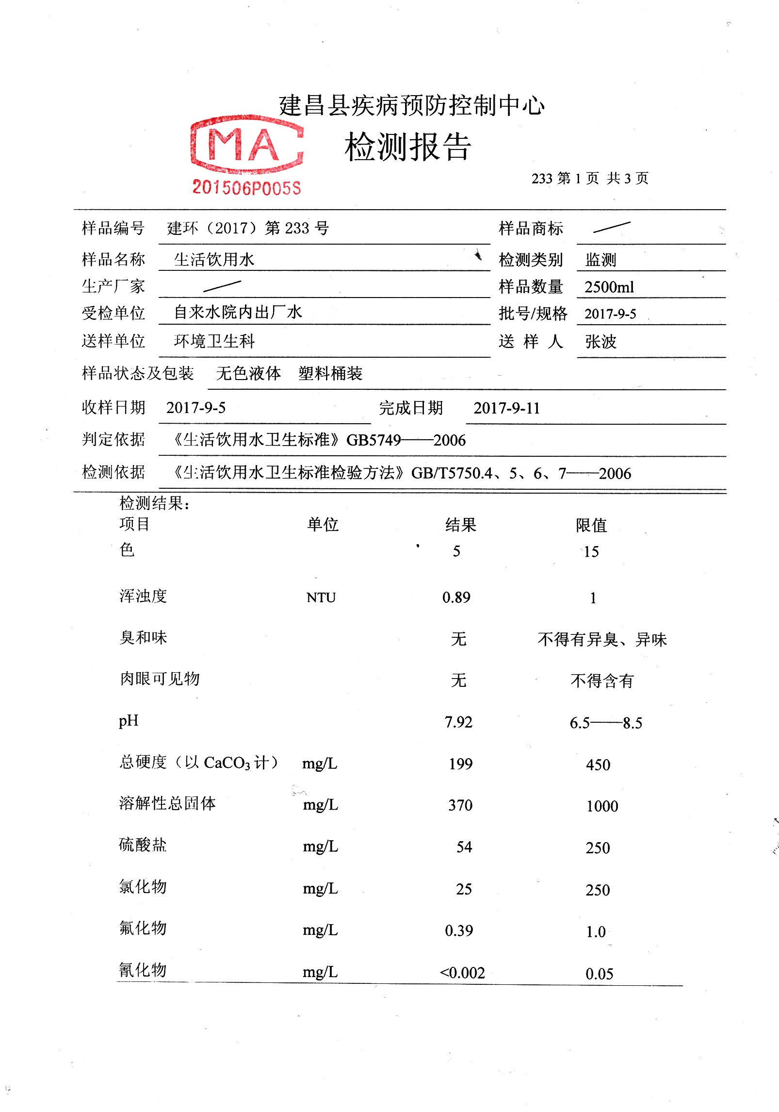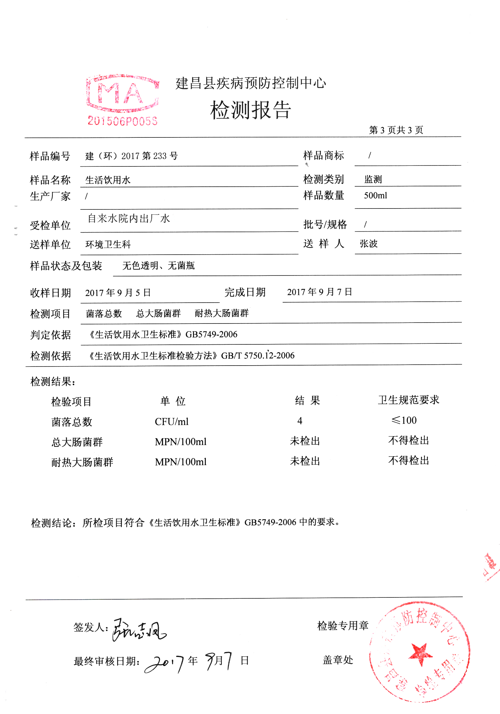 2017年09月 水质检测报告