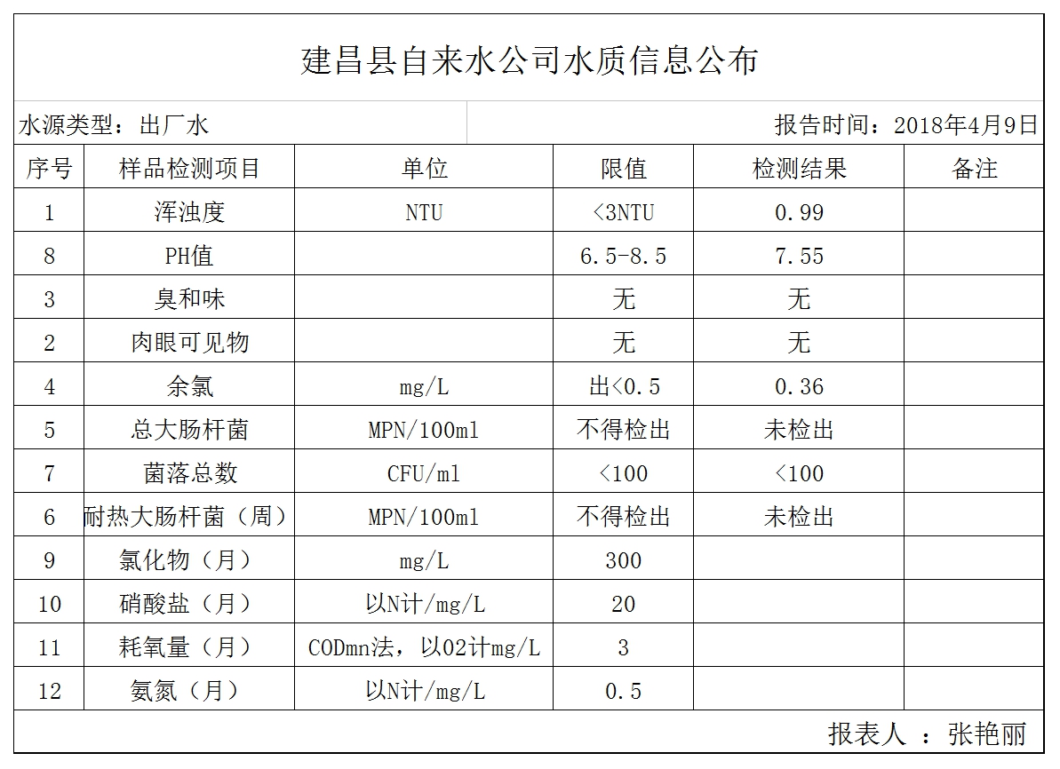水质信息公布 2018年4月9日